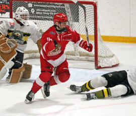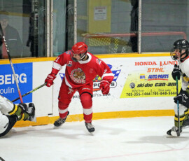 After withstanding a Powassan power play to commence the extra session, the home side eventually prevailed when McLean darted down the left wing and fired a shot that went wide left of the net, but saw it skip off the end boards and out the other side where he quickly swatted in the game-winner to end it.