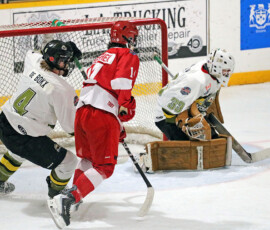 The best chance to convert in a scoreless first period came when Powassan’s Caleb Dawson rang a shot off the crossbar and out with 7:30 to play in the session.